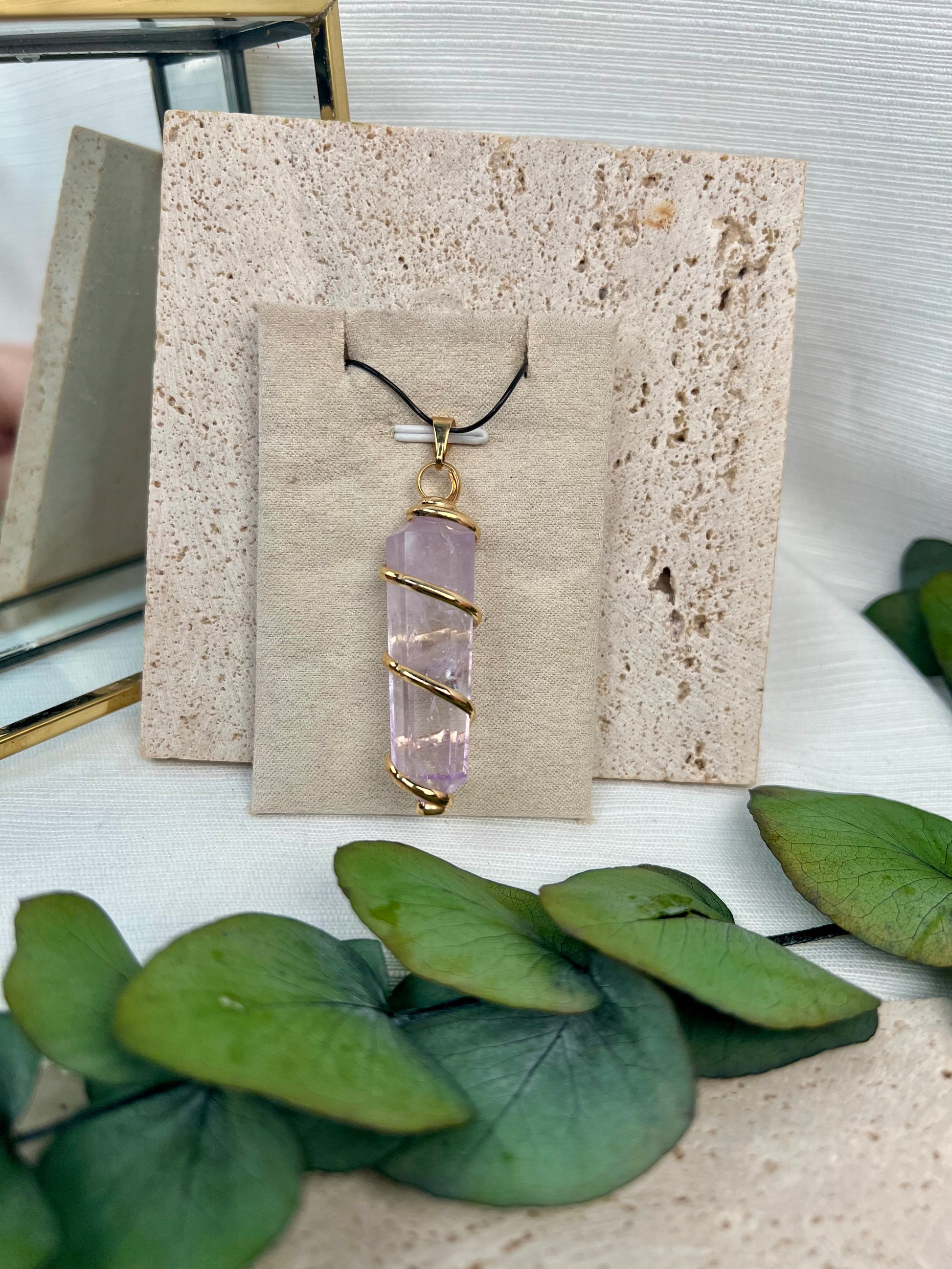 Amethyst in spiralförmiger Fassung, elegant vergoldet – mystisch und modern.