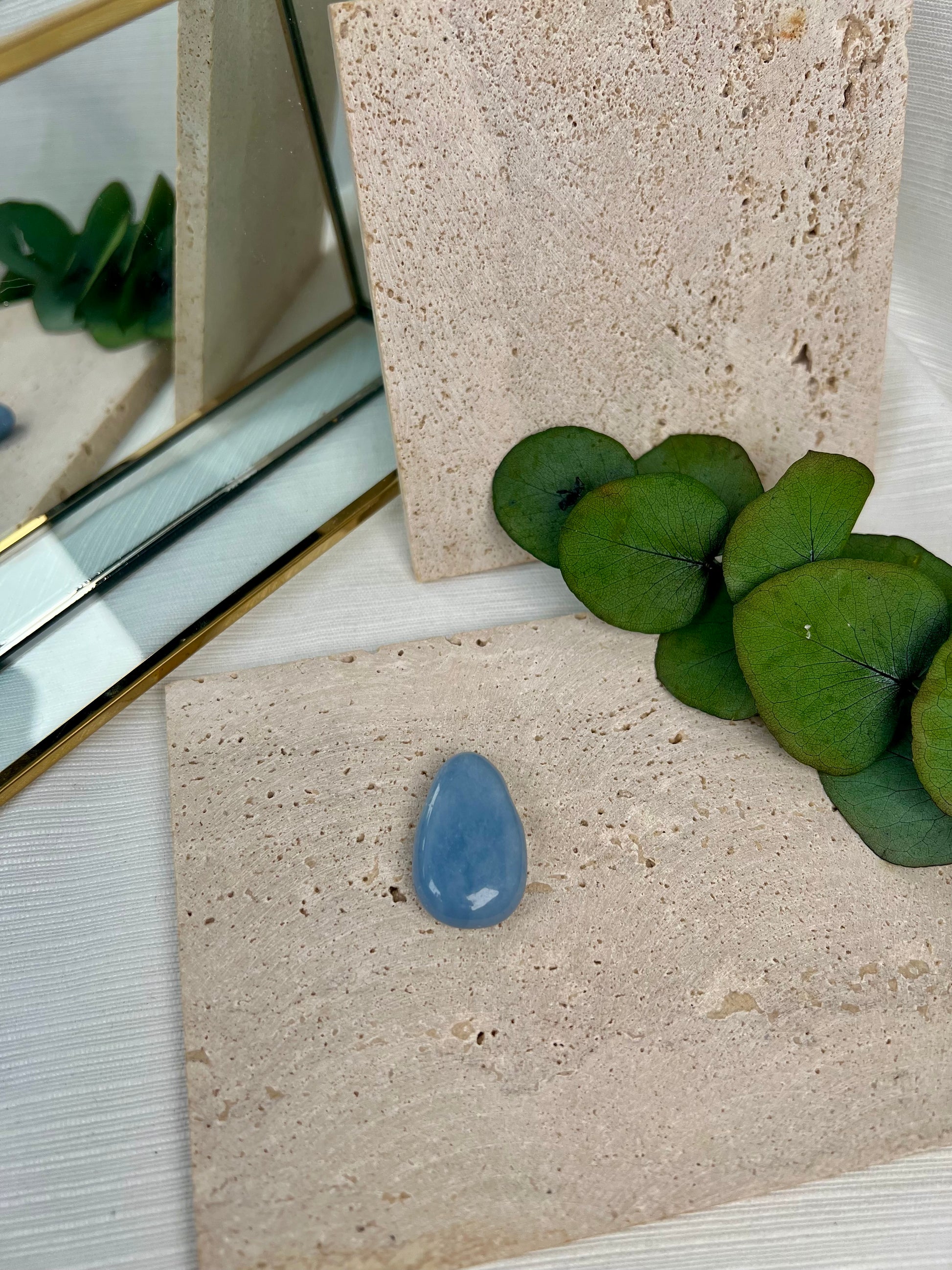 Angelit Anhänger, gebohrt – himmelblau und sanft matt schimmernd, wirkt beruhigend und verbindet mit innerer Ruhe. Ein zarter Begleiter für Ketten oder Bänder.