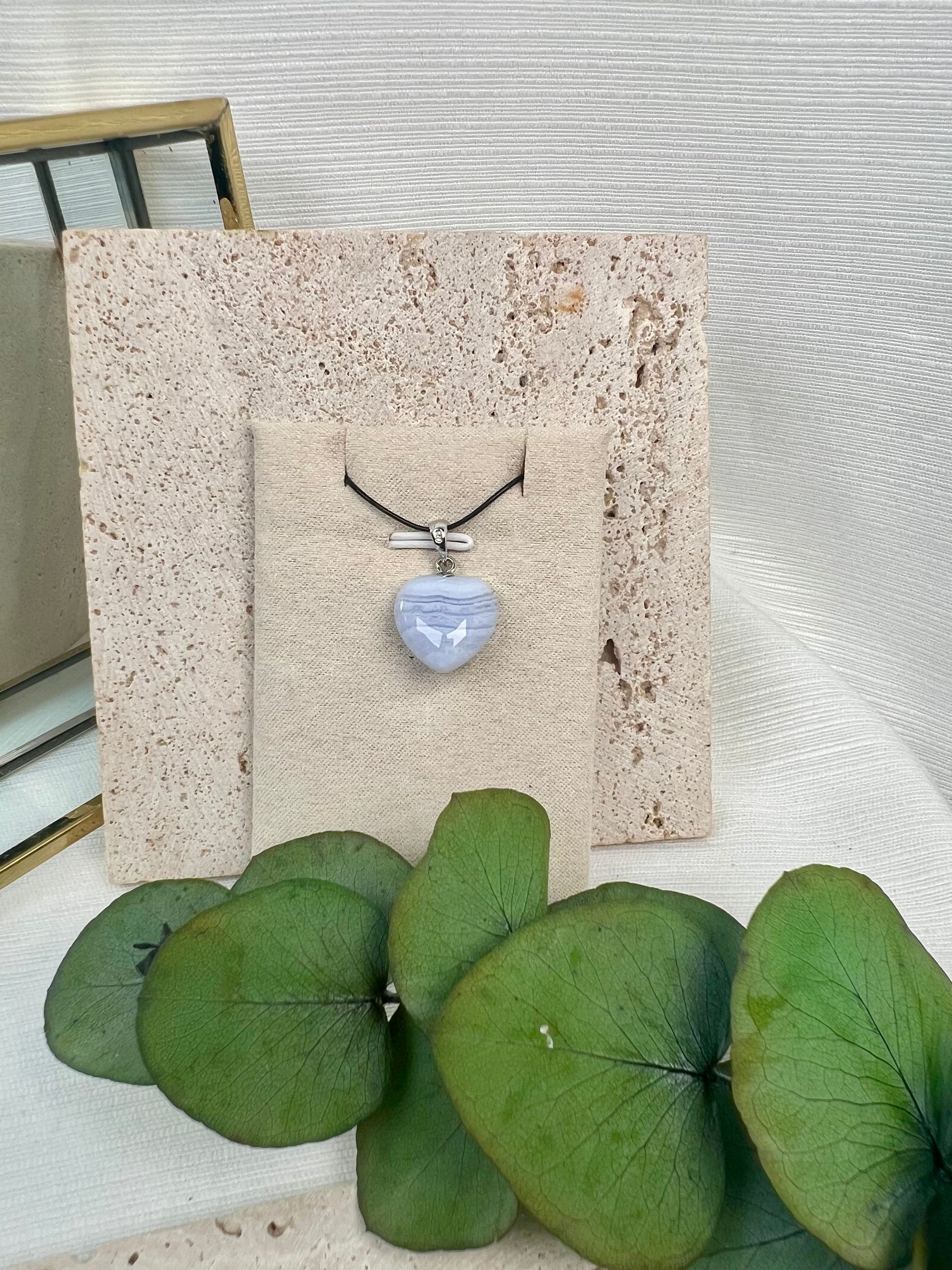 Herzförmiger Blue Lace Achat mit feiner Silberöse – sanft, beruhigend und elegant.