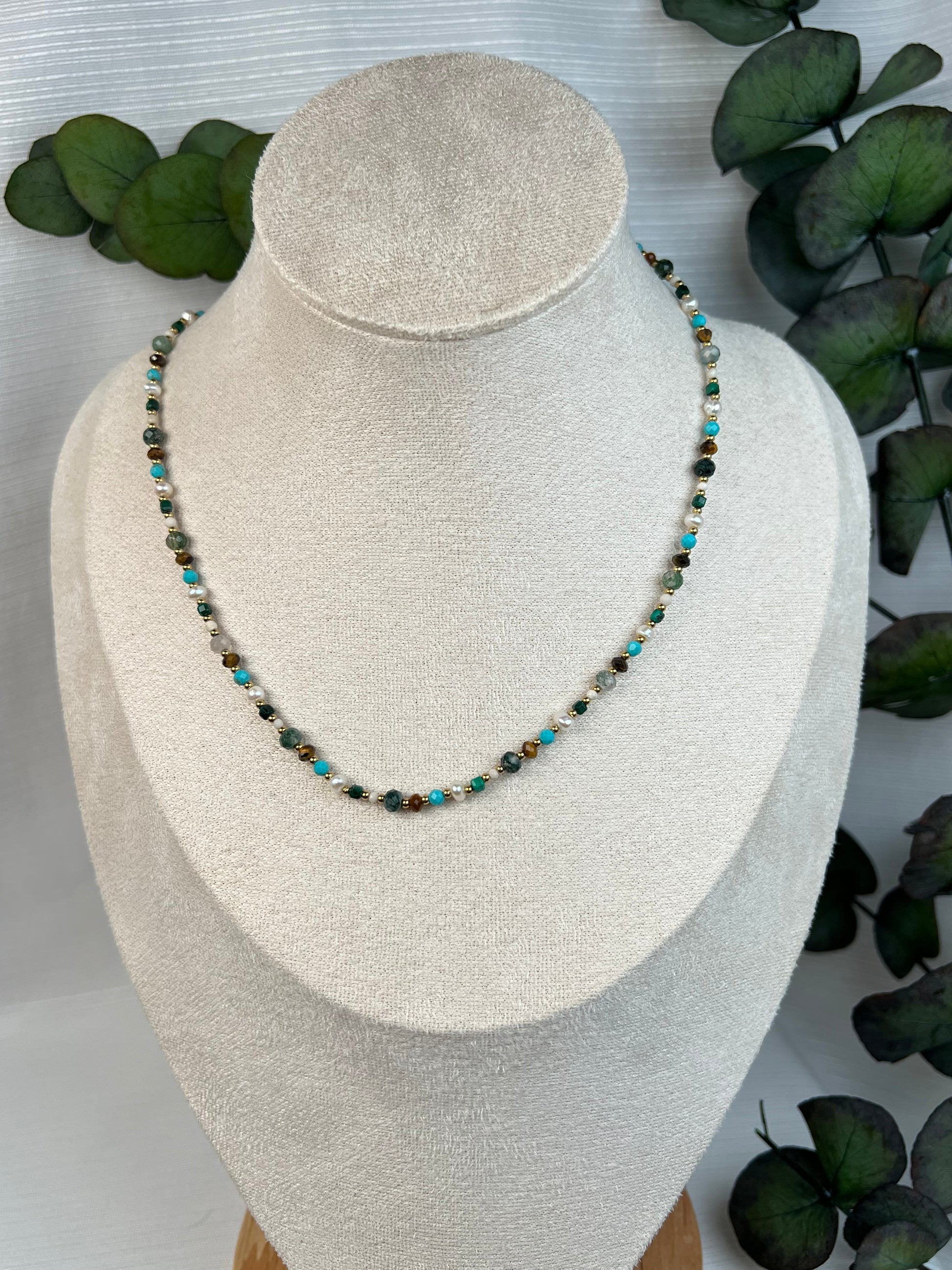 Kette aus verschiedenen kleinen facettierten Halbedelsteinen (Moosachat, Tigerauge, Achat, Türkis, Malachit, Süßwasserperle) und goldenen Edelstahlperlen.