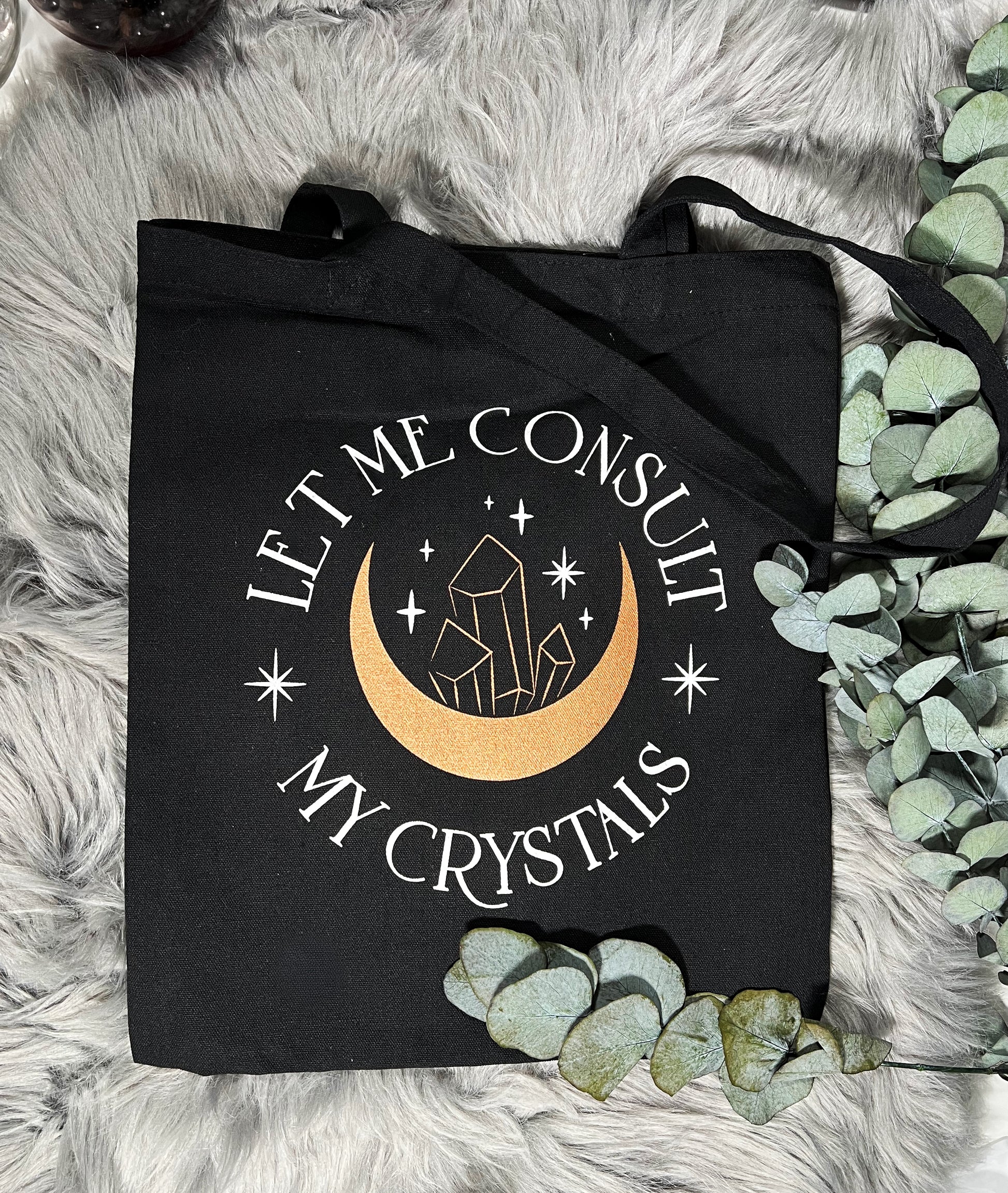 Jutebeutel mit Druckbild und Aufschrift "let me consult my crystals"