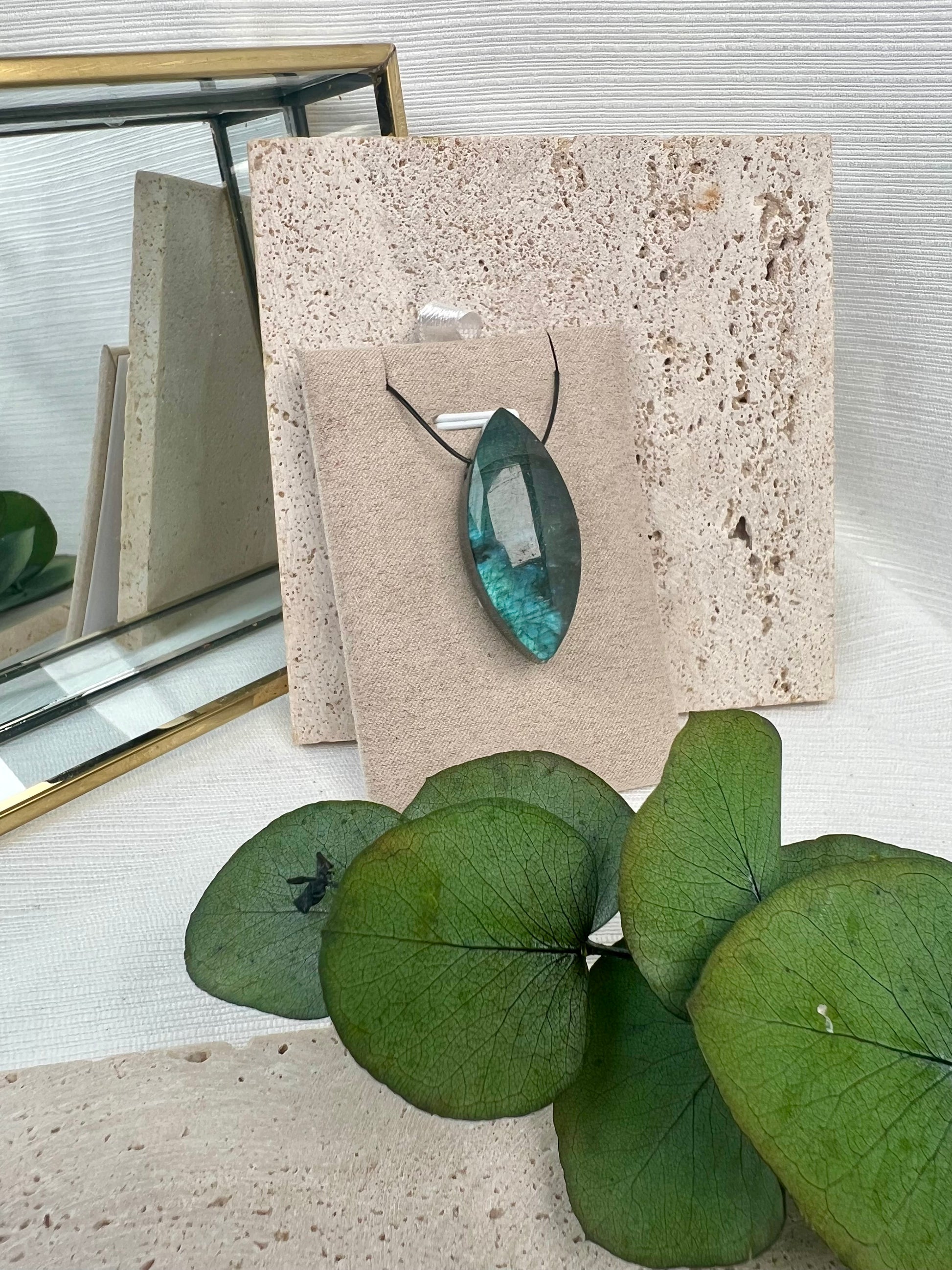 Labradorit in Navette-Form gebohrt – geheimnisvoll schimmernd mit blauen und grünen Lichtblitzen, mystisch und faszinierend.
