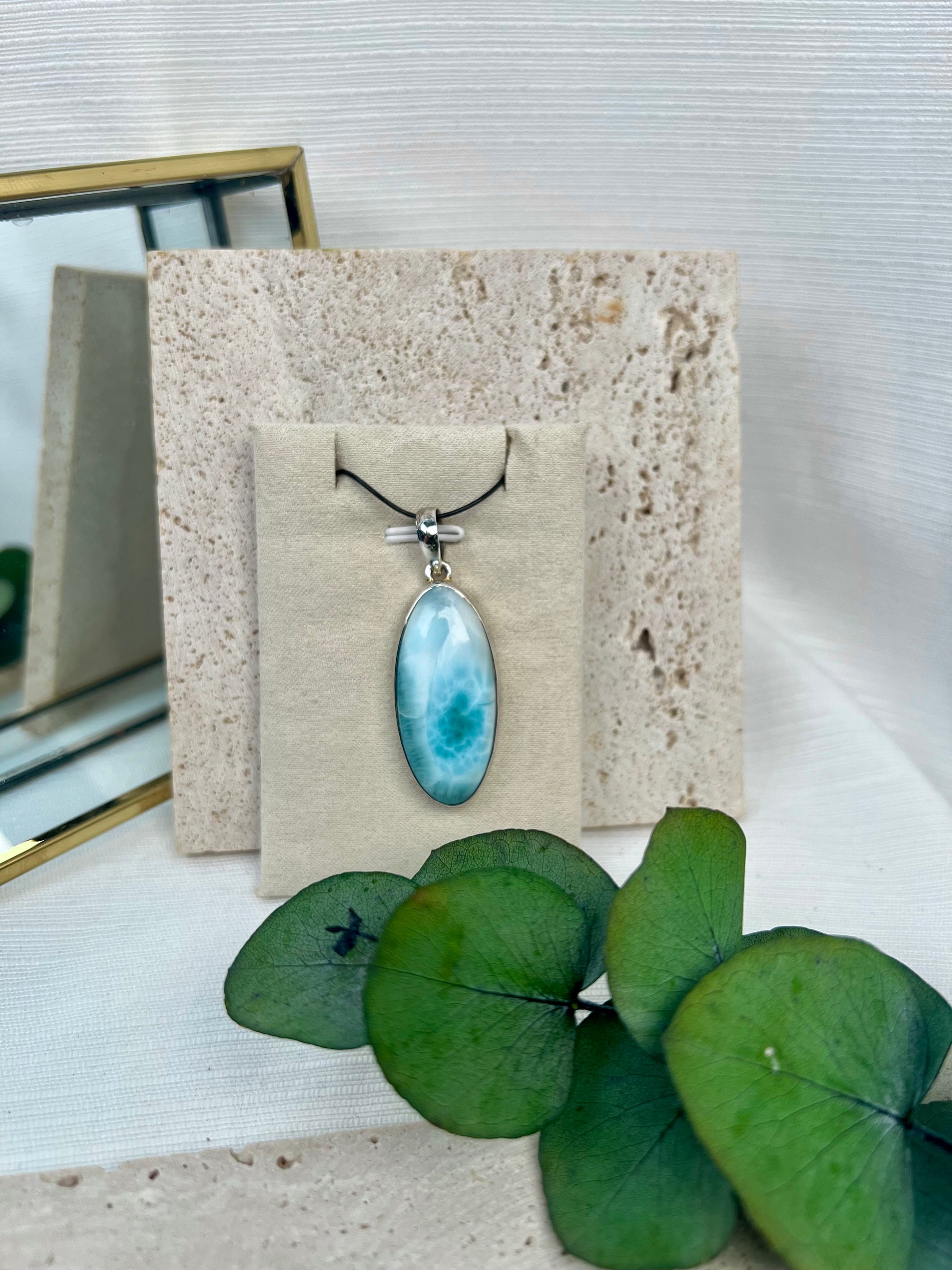 Larimar, stilvoll in Silber gefasst – sanft, elegant und beruhigend.