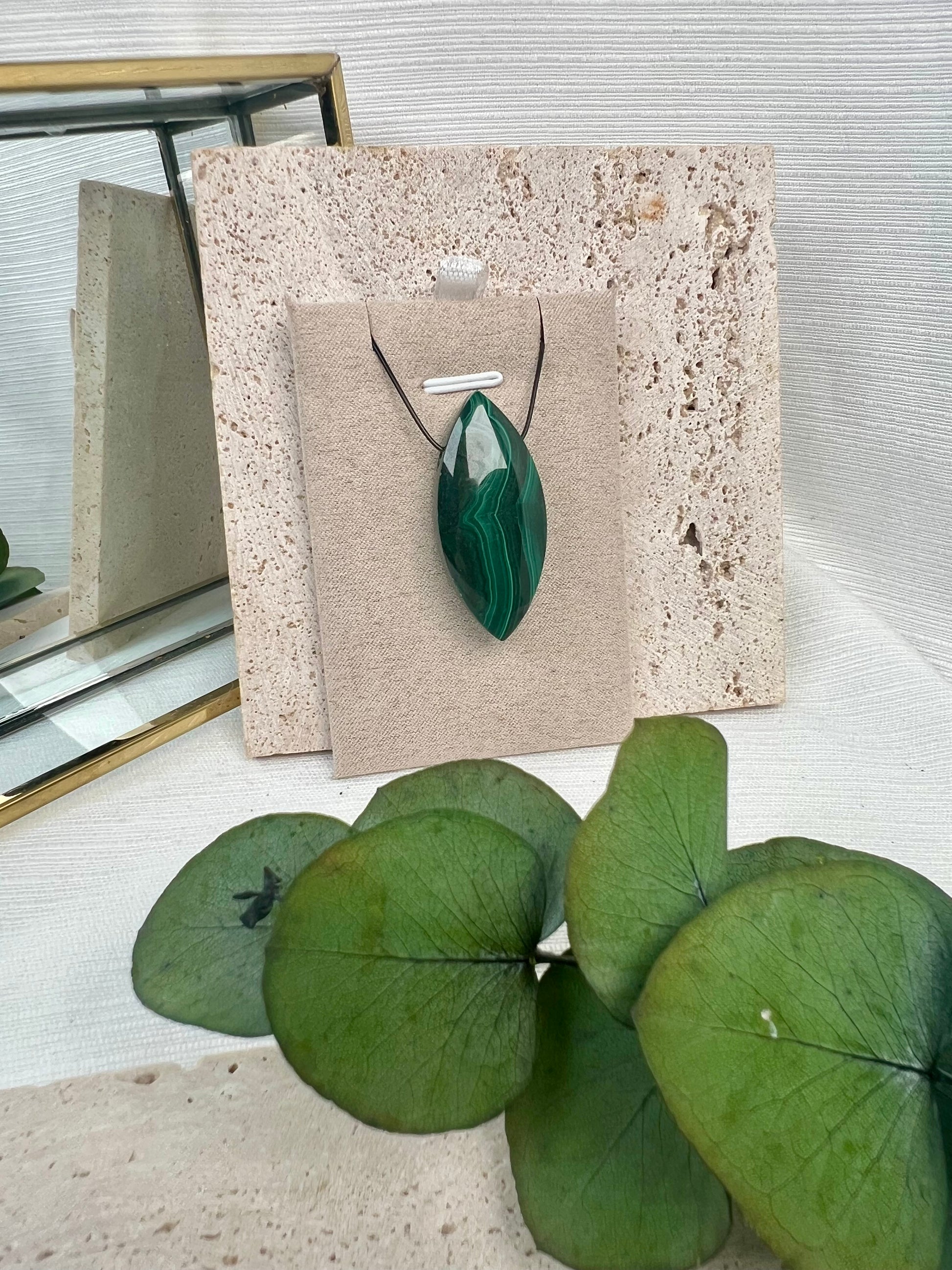 Malachit in Navette-Form gebohrt – tiefgrün mit markanten Maserungen, kraftvoll und elegant.