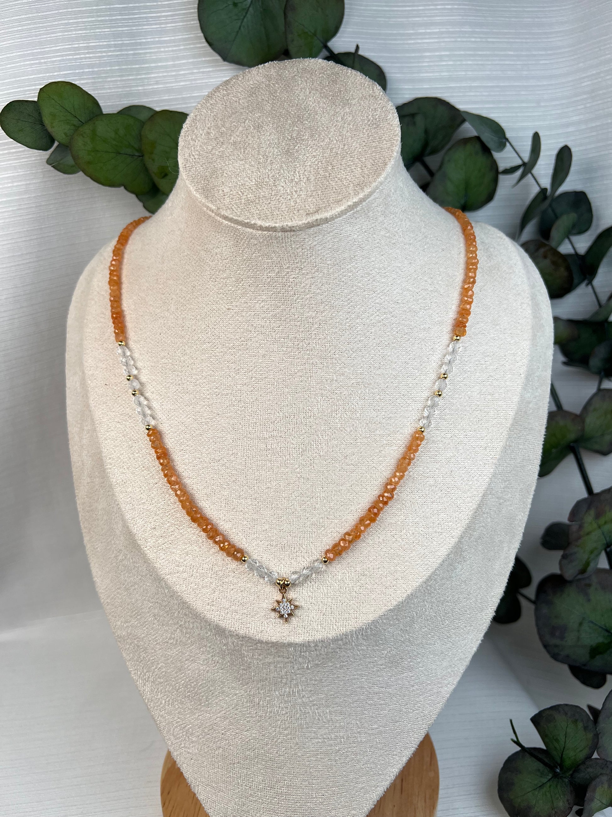 Handgemachte Kette aus facettierten Mandarinen-Granaten und Bergkristallen, ergänzt durch vergoldete 925er-Silberperlen.