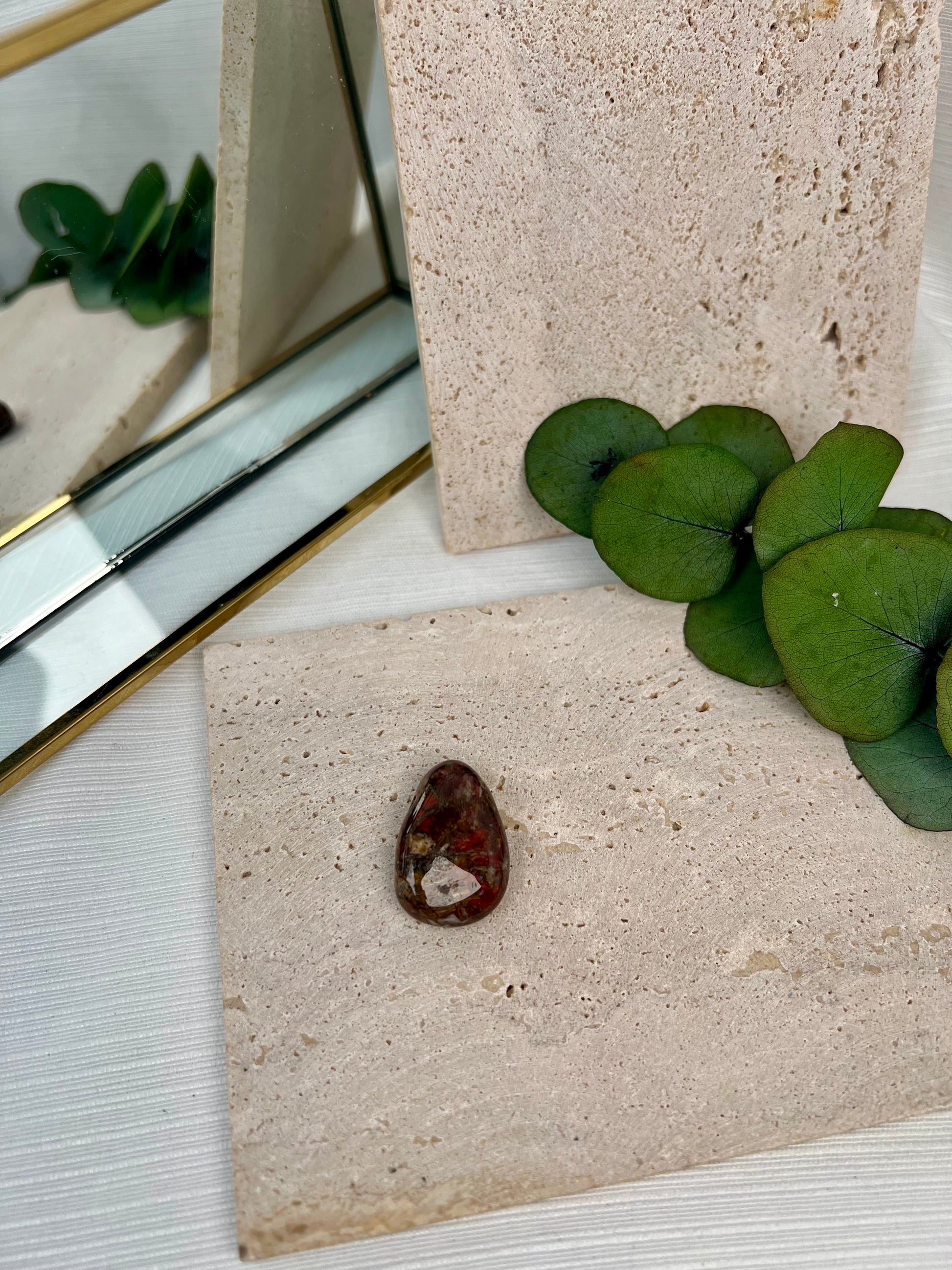 Pietersit Anhänger, gebohrt – braun mit wirbelndem rotem Farbspiel, wirkt kraftvoll und dynamisch. Ein faszinierender Blickfang für Ketten oder Bänder.
