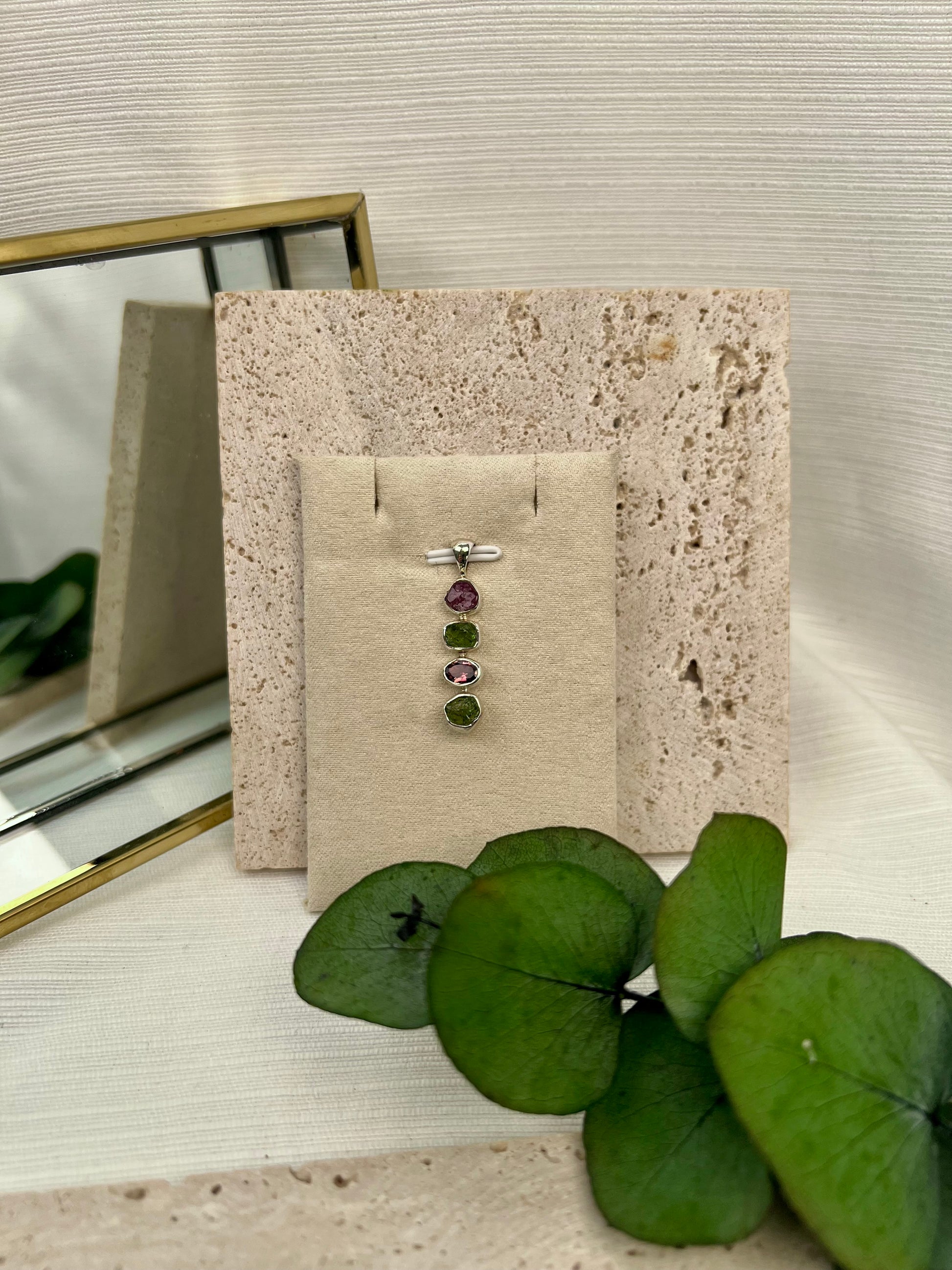 Anhänger aus Silber mit pinken und grünen Turmalinen – 2 natürliche grüne und 2 pinke Steine, roh und facettiert, lebendig und einzigartig.