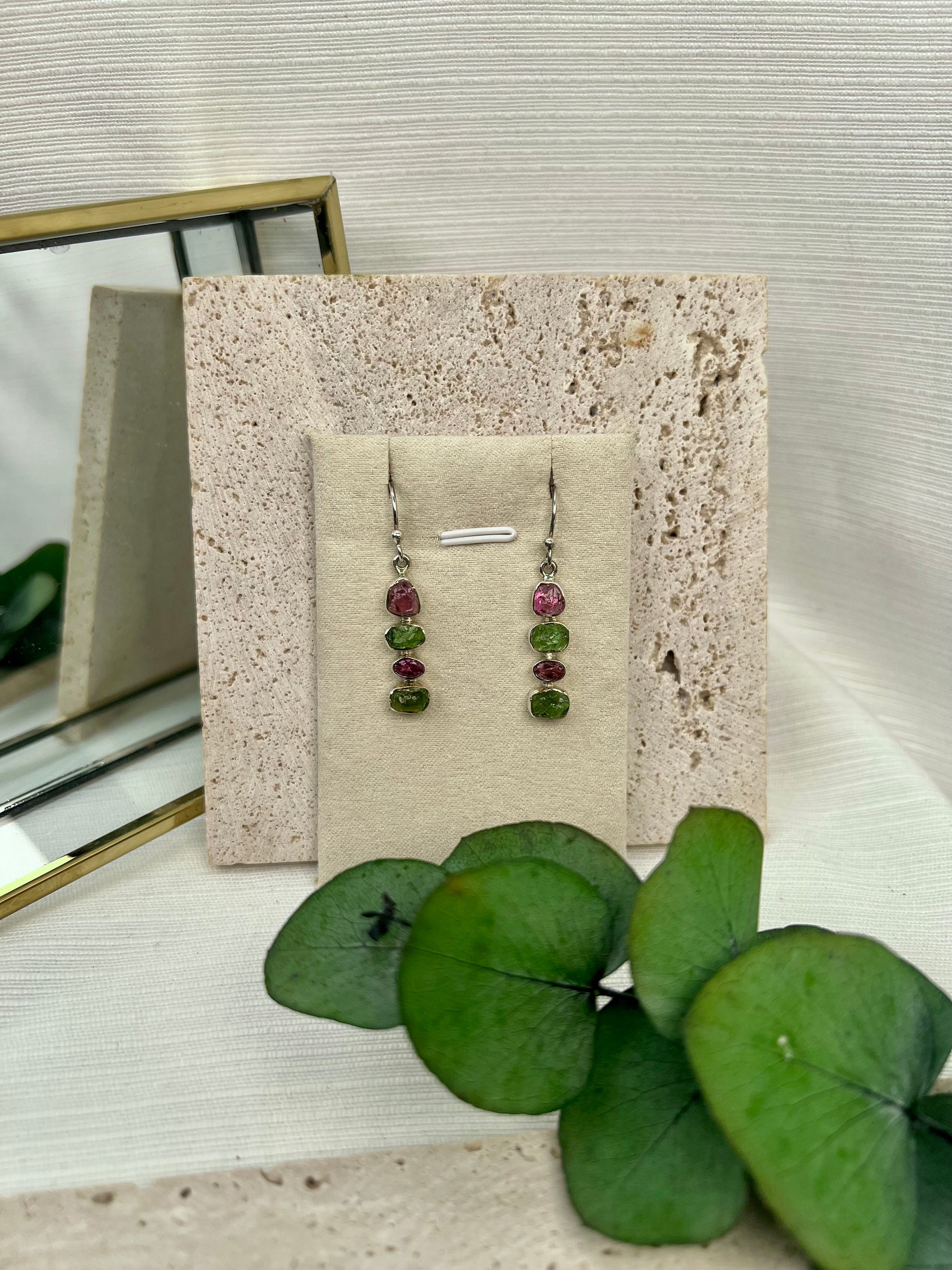 Ohrringe aus Silber mit pinken und grünen Turmalinen – je 2 natürliche grüne und 2 pinke Steine, roh und facettiert, für einen lebendigen, natürlichen Look.