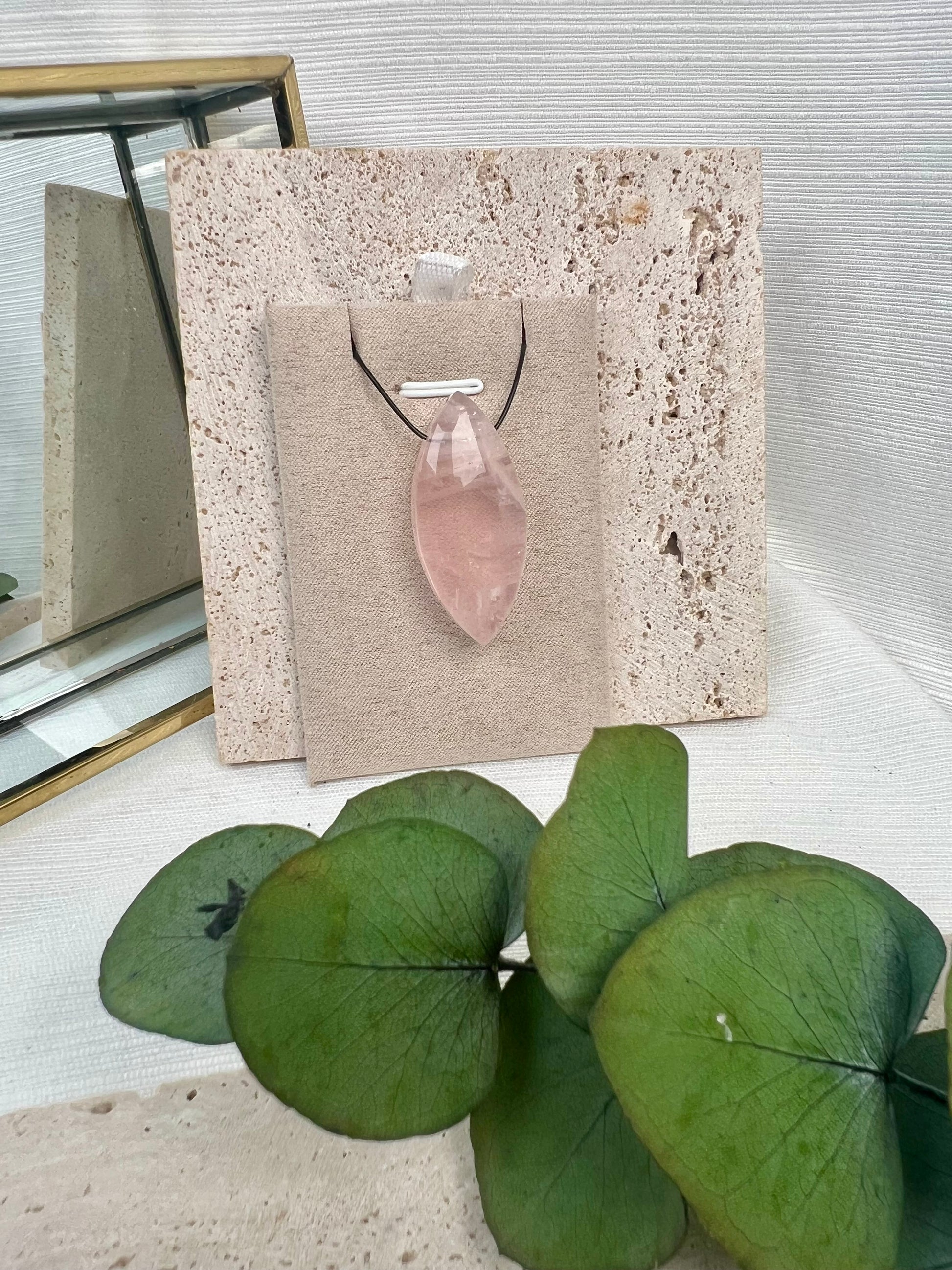 Rosenquarz in Navette-Form gebohrt – sanft roséfarben, Symbol für Liebe und Harmonie.