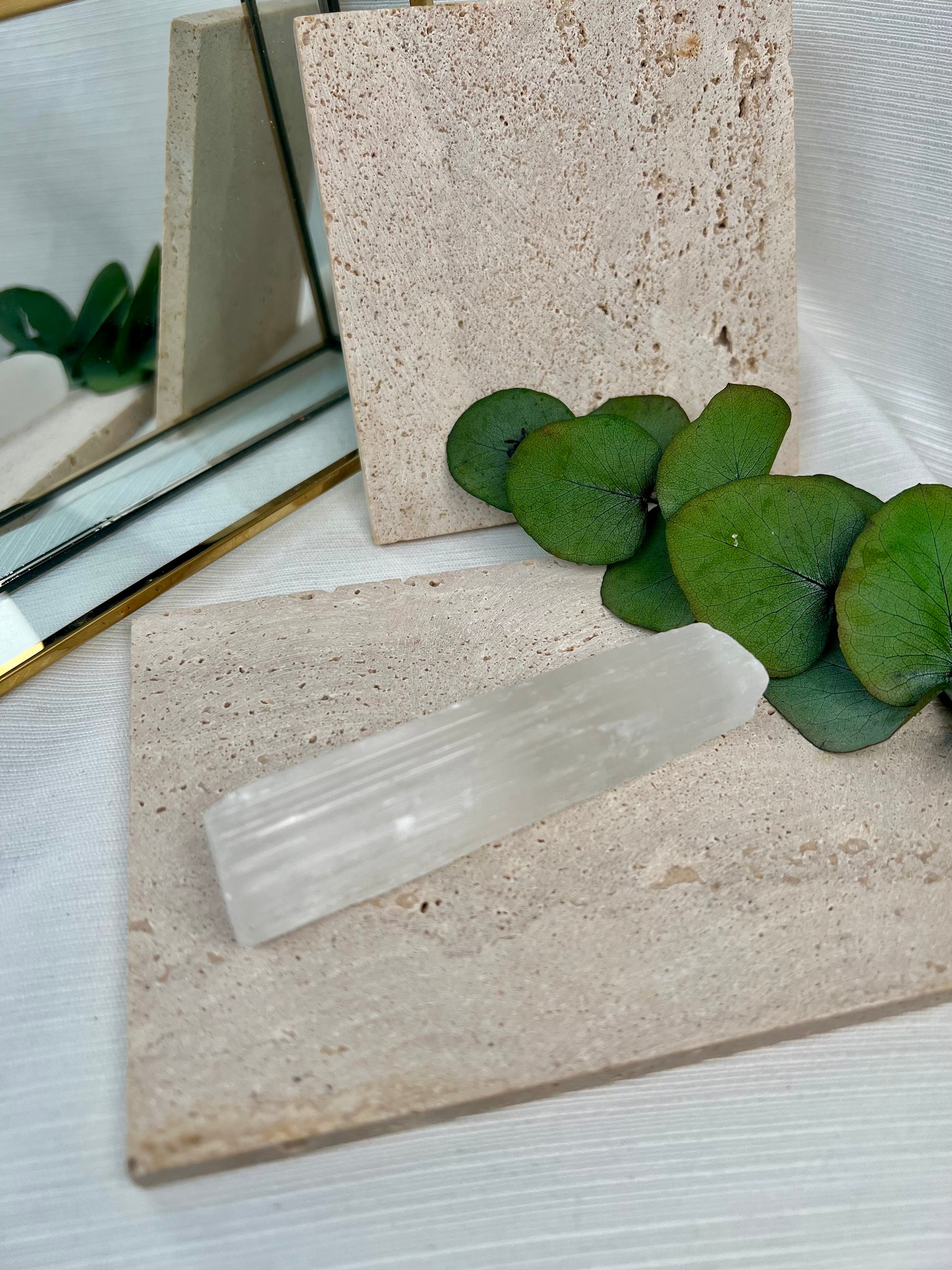 Selenit Stab – Reinigt und lädt Kristalle sowie Räume energetisch auf, bringt Klarheit und Ruhe.