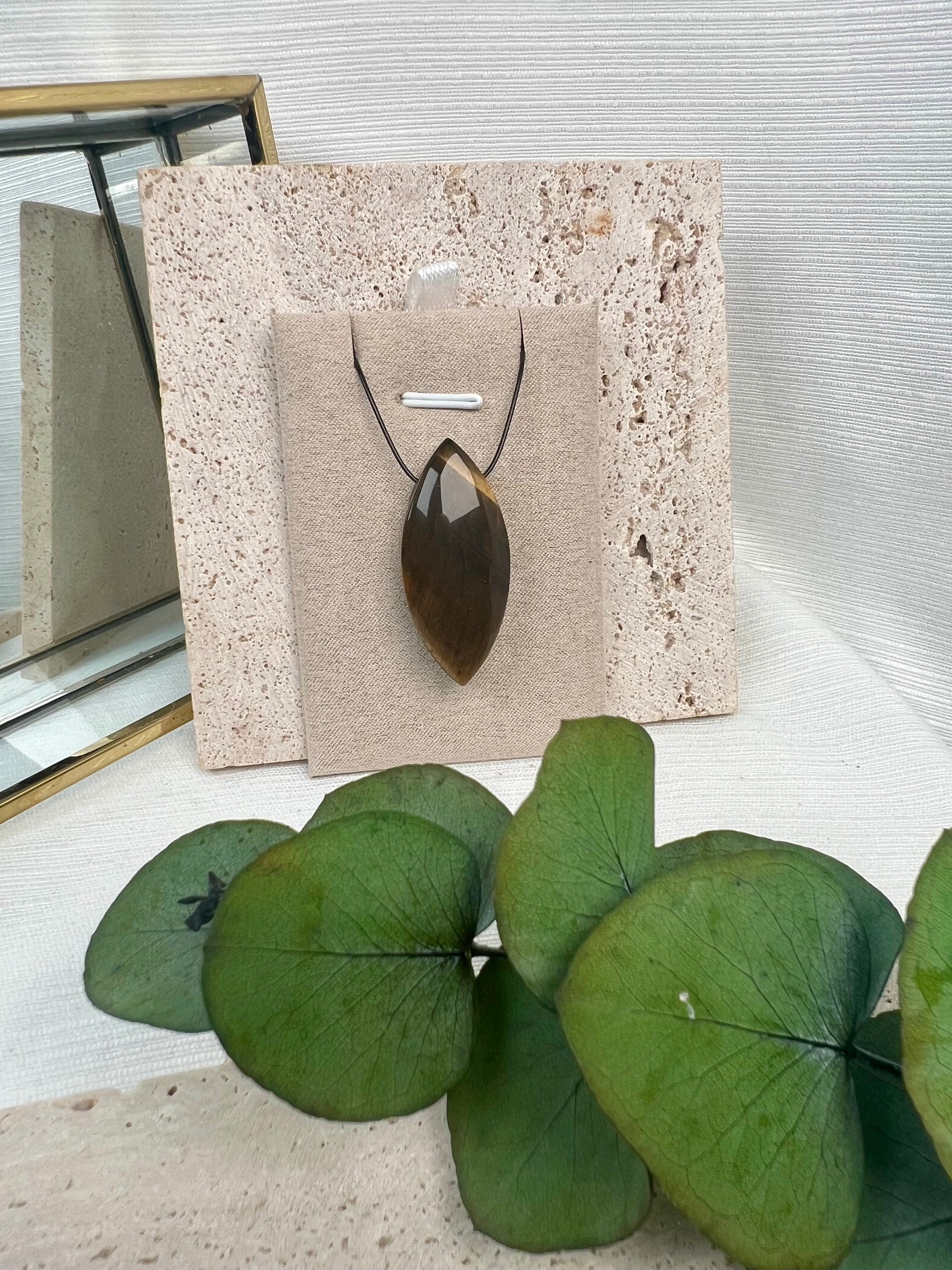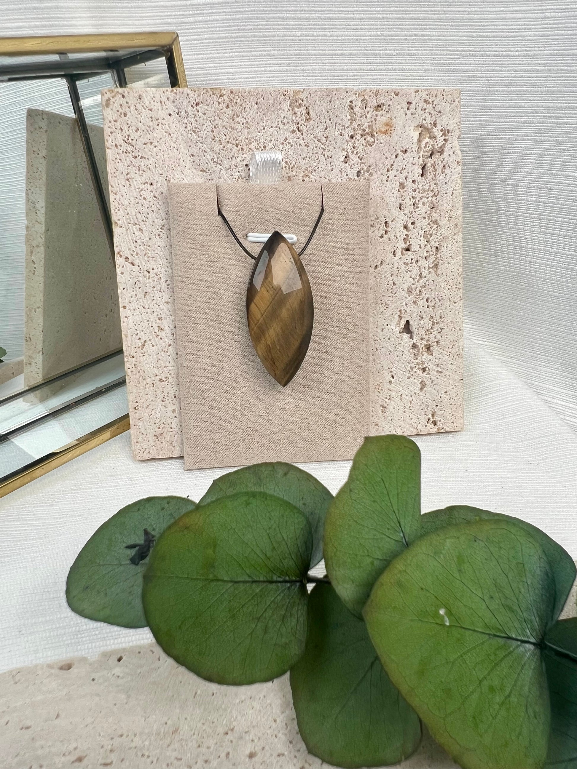 Tigerauge in Navette-Form gebohrt – goldbraun schimmernd mit lebendigem Katzenaugeneffekt, ein kraftvoller Begleiter.