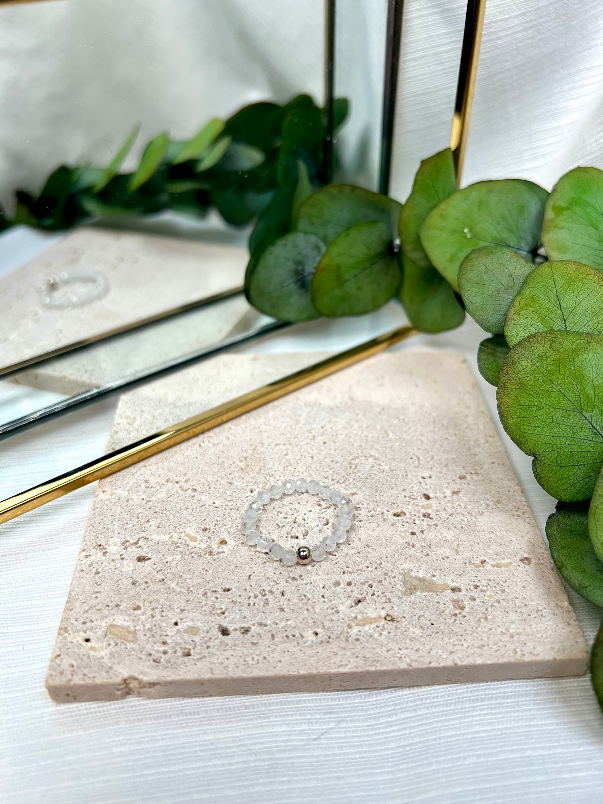 Facettierter weißer Mondstein Perlenring mit einer feinen 925 Silberperle